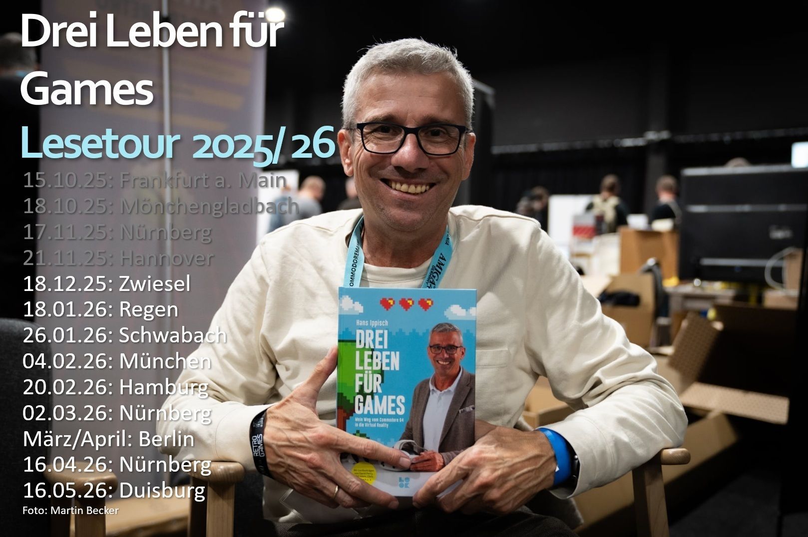 Nürnberg - 29. September 2025 Der große Tag rückt näher. Das Buch „Drei Leben für Games: Mein Weg vom C64 in die Virtual Reality“ ist in Druck gegangen. Es wird am 18. Oktober bundesweit erhältlich sein, man kann es ab sofort direkt beim Verlag und natürlich bei Amazon, Thalia, Hugendubel & Co. und im gut sortieren Buchhandel vorbestellen. Der Autor wird das Buch in den nächsten Monaten persönlich vorstellen, beispielweise auf der Frankfurter Buchmesse und bei Amiga 40 in Mönchengladbach, ebenso beim Symposium in Nürnberg und im HI-SCORE Videospielmuseum in Hannover. Ganz besonders freut sich Hans auf die Termine in seiner niederbayerischen Heimat. Am 18. Dezember wird er zunächst im Gymnasium Zwiesel für die Schüler vor Ort sein, wo 1984 im Computerraum alles begann. Ab 16:30 Uhr ist er dann zu Gast bei Bücher Wegmann. Weitere Termine (Retro Spiele Club Hamburg, Videospielkultur e.V., Gamerei, Computerspielemuseum Berlin, GG Bavaria u.a.) folgen…